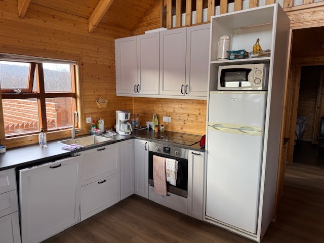 Í eldhúsi eru ísskápur með frystihólfi, uppþvottavél og önnur rafmagnstæki og borðbúnaður fyrir 12 manns.